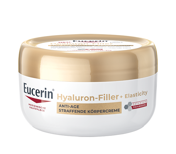 Hamburg - Gegen die relevanten Zeichen der Hautalterung präsentiert Eucerin die neue Anti-Age Körpercreme für straffere, ebenmäßige und strahlende Haut. Die erste Körpercreme der Hyaluron-Filler + Elasticity Produktserie bietet einen dreifachen Effekt gegen fortgeschrittene Zeichen der Hautalterung. Das patentierte Thiamidol® mildert Altersflecken und beugt ihrer Neuentstehung vor. Hyaluronsäure und Dexpanthenol glätten die Haut und versorgen sie mit intensiver Feuchtigkeit. Arctiin, ein pflanzlicher Wirkstoff aus der Klettenfrucht, verbessert die Hautelastizität und Festigkeit.