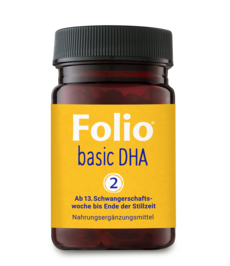 Folio® 2 basic DHA, das vegane Folsäure-DHA-Supplement für Schwangere ab der 13. Schwangerschaftswoche und für Stillende enthält neben Folsäure, Jod sowie den Vitaminen A, D3, E und B12 zusätzlich L-Methylfolat, die bioaktive Form der Folsäure, und die mehrfach ungesättigte Omega-3-Fettsäure Docosahexaensäure (DHA). Es ist in 30er- und 90er-Packungsgrößen in der Apotheke erhältlich. Nur eine einzige Hartkapsel täglich ergänzt bereits sinnvoll die Ernährung der Schwangeren und Stillenden mit ausgewählten wichtigen Mikronährstoffen in der richtigen Dosierung. Das Produkt ist glutenfrei sowie frei von Laktose, Fruktose, Farbstoffen und Aromastoffen.
