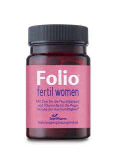 Das rezeptfreie Folio® fertil women versorgt den weiblichen Körper täglich mit 800 µg Folsäure (davon 400 µg in bioaktiver Form als L-Methylfolat). Zudem sind 150 µg Jod, 200 mg der Omega-3-Fettsäure Docosahexaensäure (DHA), 25 mg Coenzym Q10 sowie weitere Mikronährstoffe enthalten.