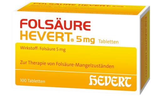 Im Zuge der Bezeichnungsänderung von Folsäure Hevert in Folsäure Hevert 5 mg Tabletten weist nun nicht nur der Name, sondern auch die Packung noch deutlicher auf die enthaltene Konzentration des Wirkstoffs „Folsäure“ und die Darreichungsform „Tabletten“ hin. Die gelbe Packungsfarbe, die in der Hevert-Produktpalette für „Vitamine“ steht, bleibt dabei erhalten. Auch an der Rezeptur hat sich nichts geändert.