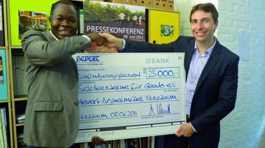 Seit Anfang 2009 läuft die Aktion „Gemeinsam für Kinder“, für welche Hevert-Arzneimittel 1 Cent je verkaufter Arzneimittelpackung an den Verein „Schulbausteine für Gando e. V.“ spendet. Im zweiten Jahr konnten nun erneut 25.000 Euro an Diébédo Francis Kéré übergeben werden. Die Scheckübergabe fand am 8. Juni während einer Pressekonferenz in den Räumlichkeiten des Vereins in der Arndtstraße in Berlin statt.