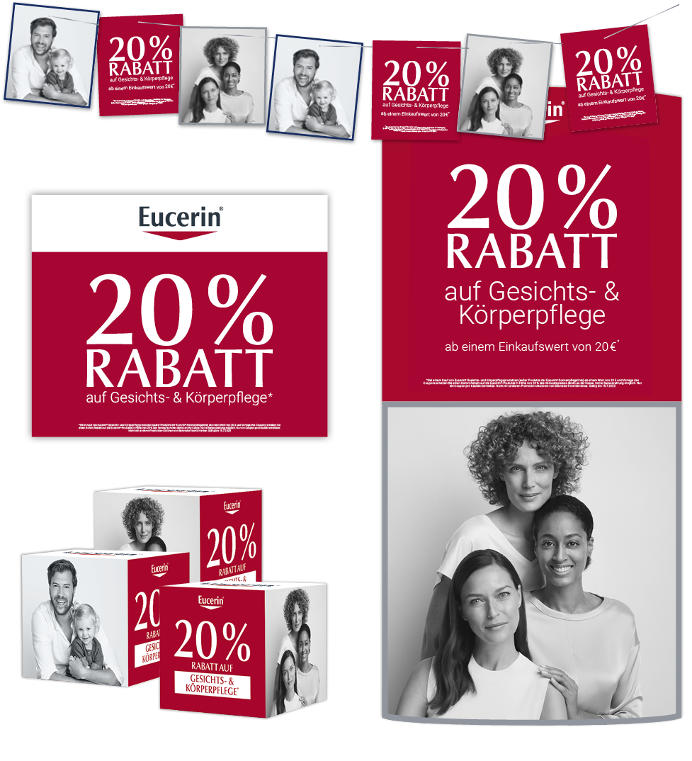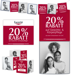 Die bisher größte Sommer-Promotion von Eucerin umfasst das gesamte Sortiment an hochwertigen Gesichts- und Körperpflege-Produkten*. Beim Kauf* von Eucerin Produkten gibt es in teilnehmenden Apotheken ab einem Wert von 20 Euro einen Rabatt von 20 %. In Online-Apotheken gibt es im Aktionszeitraum statt der 20 Prozent beim Kauf eines Face Anti-Age Hyaluron-Filler-Produktes ein 50 ml Hyaluron-Filler + 3x Effect Hyaluron Spray gratis.**