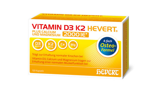 Nussbaum - Die Präparate Vitamin D3 K2 Hevert plus Calcium und Magnesium 1000 IE und 2000 IE mit der 4-fach Osteo-Formel bieten eine optimale Mikronährstoff-Kombination mit den Vitaminen D und K sowie den Mineralstoffen Calcium und Magnesium in einer Kapsel. Ab August 2021 gibt es beide Nahrungsergänzungsmittel nun auch als Vorratspackung mit 120 Kapseln.