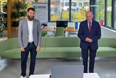 Mathias Hevert (l.), Geschäftsführer von Hevert-Arzneimittel GmbH & Co. KG sowie stellvertretender Vorstand der Hevert-Foundation, und Professor Harald Walach (r.), Medizinische Universität Poznan, Polen, sowie Gastprofessor an der Universität Witten-Herdecke (Philosophische Grundlagen der Psychologie), gratulieren der diesjährigen Preisträgerin Nina Bauer Corona-bedingt mit Abstand per Videokonferenz aus dem Berliner Büro der Hevert-Foundation.