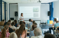 Dr. Maria Olga Kokornaczyk referiert vor Teilnehmern von Forschungseinrichtungen, Verbänden und aus der Industrie über die Untersuchung von homöopathischen Tiefpotenzen mittels der Tropfenverdunstungsmethode.