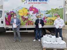 V. l.: Verbandsbürgermeister Uwe Engelmann und Büroleiter Rainer Link freuten sich über die Spende von 40 Kanistern Handdesinfektionsmittel an die Verbandsgemeinde Nahe-Glan, die stellvertretend von Gerd Voigt, Leiter Logistik, überreicht wurden. Foto: Hevert-Arzneimittel