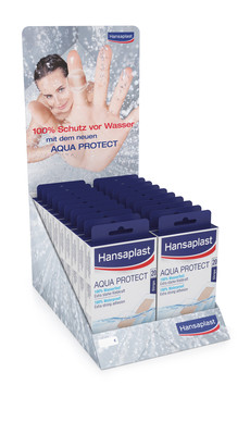 Das aufmerksamkeitsstarke HV-Display mit 20 Pflasterpackungen stellt die Vorteile der neuen Hansaplast Aqua Protect (20 Strips) ganz klar in den Mittelpunkt: Die Pflaster sind nun 100 % wasserfest und wurden speziell zur Verwendung beim Duschen, Baden und Schwimmen weiterentwickelt.