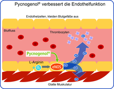 Pycnogenol® ist schon seit langem als starkes Antioxidans bekannt. Viele Studien zeigen zusätzlich seine positiven Effekte auf die endothelialen Funktionen, den Blutdruck sowie die Aggregationsneigung der Thrombozyten[1]. Pycnogenol® kann die Endothel-NO-Synthese aus dem Vorläufermolekül L-Arginin steigern, indem es die endotheliale NO-Synthase anregt. Dadurch wird das Blutgefäßlumen erweitert und eine ausreichende Gewebedurchblutung gewährleistet. Dabei wurde festgestellt, dass ein Metabolit von Pycnogenol® durch erleichterte Aufnahme in Endothelzellen angereichert wird und damit direkt im Endothel entzündungshemmend wirken kann[2].