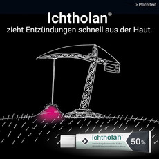 Wirkstoff: Ammoniumbituminosulfonat. Zusammensetzung: 100 g Salbe enthalten: Ammoniumbituminosulfonat (Ichthyol®) 10 g / 20 g / 50 g. Sonstige Bestandteile: Ichtholan® 10 % / 20 % / 50 %: Gelbes Vaselin, Wollwachs, gereinigtes Wasser; Ichtholan® 50 % außerdem: Mikrokristalline Kohlenwasserstoffe (C40-C60). Anwendungsgebiete: Ichtholan®10 %: Oberflächliche entzündliche Erkrankung der Haut; Ichtholan® 20 %: Zur Reifung von Furunkeln und oberflächlich abszedierenden Prozessen; Ichtholan® 50 %: Zur Reifung von Furunkeln und abszedierenden Prozessen, zur unterstützenden Behandlung bei Gonarthrose sowie bei Prellung, Verstauchung. Gegenanzeigen: Ichtholan® 10 % / 20 % / 50 %: Überempfindlichkeit gegen sulfonierte Schieferöle, wie z. B. Ammonium- und/oder Natriumbituminosulfonat und/oder einen der sonstigen Bestandteile; Ichtholan® 10 % außerdem: spezifische entzündliche Hautkrankheiten; Ichtholan® 10 % und 20 %: Schwangerschaft und Stillzeit. Kontakt mit den Augen vermeiden. Nebenwirkungen: Selten (< 0,1 %) Unverträglichkeitsreaktionen der Haut (heftiges Jucken, Brennen, stärkere Rötung); Ichtholan® 50 %: in seltenen Fällen (< 0,1 %) Blasenbildung, Kontaktallergie. Warnhinweis: Enthält Wollwachs und Butylhydroxytoluol. Ichthyol-Gesellschaft Cordes, Hermanni & Co. (GmbH & Co.) KG, Sportallee 85, 22335 Hamburg
