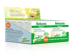 Wenn das biologische Gleichgewicht – beispielsweise durch eine unausgewogene Ernährung, Stress, Verstopfung, Durchfall oder eine Antibiotika-Therapie – ins Schwanken geraten ist, kann Bekunis Balance helfen. Nach einer Antibiotika-Therapie wird die Einnahme von zwei Sticks täglich empfohlen. Das laktosefreie, vegane Granulat Bekunis Balance ist für Erwachsene und Kinder ab 2 Jahren geeignet.