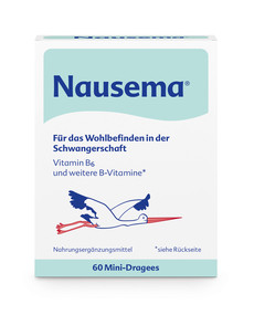 Klinische Studien zeigen, dass die tägliche Substitution von Vitamin B6 die Schwere der Schwangerschaftsübelkeit und das Auftreten von Erbrechen bereits nach vier bis sieben Tagen signifikant reduziert.4 Empfehlenswert ist es, die synergistischen Effekte von Vitamin B6 mit Vitamin B1 sowie Vitamin B12 (in Nausema®, rezeptfrei in der Apotheke erhältlich) zur Behandlung von Nausea gravidarum optimal zu nutzen. Vitamin B1 und B12 mindern zusätzlich Geruchsempfindlichkeit und Übelkeit. Mit täglich drei Mini-Dragees Nausema® lassen sich nachweislich Übelkeit und Erbrechen in der Schwangerschaft reduzieren – und das ganz natürlich, denn Nausema® ist sehr gut verträglich. Im Einzelfall kann die tägliche Dosis auch gesteigert werden. Die Einnahme dieser laktose-, gluten-, farb- und aromastofffreien Mini-Dragees kann über die gesamte Schwangerschaft erfolgen.