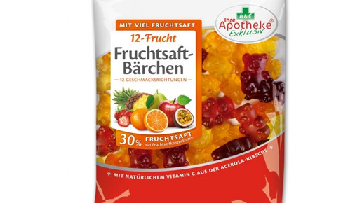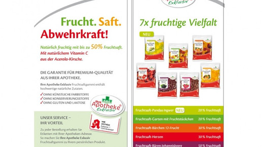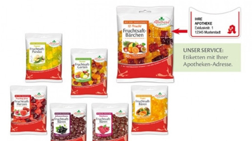 Die Marke, die jeder Apotheker mit einem eigenen Adressetikett zu seiner Eigenmarke machen kann, bietet 7 fruchtige Fruchtsaftgummi-Varianten. Als einziges Fruchtsaftgummi-Sortiment in der Apotheke enthalten die Produkte bis zu 50 % Fruchtsaft. Für Abwehrkraft sorgt der Zusatz von natürlichem Vitamin C aus der Acerola-Kirsche.