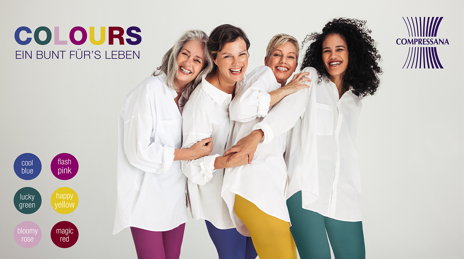2024 ist auch das Jahr selbstbewusster, modischer Akzente. COMPRESSANA liefert dafür wieder topaktuelle Trendfarben, die vom Leben inspiriert sind: Die sechs Farben Magic Red, Happy Yellow, Lucky Green, Flash Pink, Bloomy Rose und Cool Blue stehen dabei im wahrsten Sinne des Wortes für „Ein Bunt fürs Leben“. Die kräftigen Farben lassen sich hervorragend mit den unterschiedlichsten Styles kombinieren und strahlen eine ungebrochene Lebensfreude aus. Mit den Standardfarben und den Gradient Colours stehen bis zu sechzehn Farben zur Wahl. Die Gradient Colours sind mit einer speziellen Tauchfärbung bearbeitet, so dass der Kompressionsstrumpf einen einzigartigen Farbverlauf zeigt. Die Trendfarben sind für die Qualitäten COMPRESSANA SENSITIV, LEGANZA und DIAMONDS sowie für die Flachstrick-Qualitäten FORTE pro und FORTE stabil erhältlich.