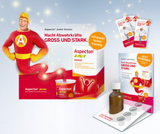 „Aspecton® Junior Immun. Macht Abwehrkräfte groß und stark“ – unter diesem Motto steht die neue Apothekenaktion für große und ganz besonders für kleine Kunden. Denn Kinder leiden überdurchschnittlich oft unter Erkältungen – und brauchen deshalb echte Power für ihr Immunsystem. Mit attraktiven Maßnahmen für alle Kundenkontaktpunkte macht Aspecton® auf diesen Umstand aufmerksam – und unterstützt gezielt den Abverkauf in der Apotheke. Teil der Aktion ist eine Verkostung, bei der sich jeder vom leckeren fruchtigen Geschmack des Präparates überzeugen kann. Außerdem können Kinder bei einem großen Namenswettbewerb tolle Preise gewinnen: Wie soll der starke Flaschengeist von Aspecton® heißen?