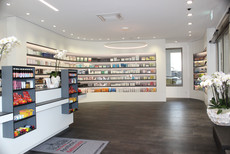 Die Sicht- und Freiwahlregale sind in einer Nischenkonstruktion in einem Wandelement eingelassen, so dass sie wie von einem Bilderrahmen umschlossen werden, was die ruhige, klare Raumstruktur unterstreicht. Alle Regalböden sind mit einem LED-Band ausgestattet, wodurch jede Regalreihe eigenständig, bis in die Tiefe beleuchtet wird. Das Materialkonzept kombiniert nüchterne weiße und graue Möbelflächen. Diese sehr schlichte sowie zeitlose Kombination bietet den perfekten Rahmen für die farbigen Packungen des Apothekensortiments.