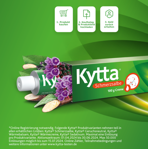 1Gilt ausschließlich für Kytta®-Produkte, welche in einer Apotheke in Deutschland gekauft wurden. Aktionszeitraum 01.04.2024 bis 30.06.2024. Teilnahme durch Hochladen des Kaufbelegs. Nur eine Einlösung pro Person möglich. Max. 25.000 Einlösungen möglich bis 15.07.2024. Onlinezähler, Teilnahmebedingungen und weitere Informationen unter www.kytta-testen.de .