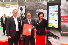 Frank Hennings, Geschäftsführer Ressort Handel bei der Sanacorp, freute sich über die Auszeichnung für „mea® – meine Apotheke“, die Tom Douglas, Geschäftsführer Aliud Pharma (l.) und Ingrid Blumenthal, Geschäftsführerin Aliud Pharma übergaben (Copyright: Sanacorp).