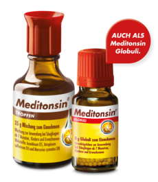 Meditonsin® Tropfen. Zusammensetzung: 10 g Mischung (19 Tropfen/g) enthalten: Aconitinum Dil. D5 (HAB,V.5a) 1 g, Atropinum sulfuricum Dil. D5 5 g, Mercurius cyanatus Dil. D8 4 g. Aconitinum ab D2, Atropinum sulfuricum ab D2 und Mercurius cyanatus ab D4 jeweils potenziert mit einer Mischung aus Ethanol 94% (G/G)/Glycerol 85%/ Gereinigtes Wasser (5:10:85). Enthält 6 Vol.-% Alkohol. Meditonsin® Globuli. Zusammensetzung: In 10 g Globuli (Größe 5) sind verarbeitet: Aconitinum Dil. D5 [HAB, Vorschrift 5a, Lösung D2 mit Ethanol 86% (m/m)] 10 mg, Atropinum sulfuricum Dil. D5 50 mg, Mercurius cyanatus Dil. D8 40 mg. Aconitinum D2 und D3, Atropinum sulfuricum D2 und D3 und Mercurius cyanatus D4 bis D6 jeweils potenziert mit einer Mischung aus Ethanol 94% (m/m)/ Glycerol 85%/ Gereinigtes Wasser (5:10:85); Aconitinum D4, Atropinum sulfuricum D4 und Mercurius cyanatus D7 jeweils potenziert mit Ethanol 73% (m/m). Anwendungsgebiete: Die Anwendungsgebiete leiten sich von den homöopathischen Arzneimittelbildern ab. Dazu gehören: Akute Entzündungen des Hals-, Nasen- und Rachenraumes. Gegenanzeigen: Überempfindlichkeit gegen die Wirkstoffe oder einen der sonstigen Bestandteile, Säuglinge unter sieben Monaten, Säuglinge von 7 bis 12 Monaten nur nach Rücksprache mit dem Arzt. Meditonsin® Tropfen: Nicht anzuwenden bei Alkoholkranken. Meditonsin® Globuli: Enthält Sucrose. Nicht anzuwenden bei Patienten mit der seltenen hereditären Fructose-Intoleranz, Glucose-Galactose-Malabsorption oder Saccharase-Isomaltase-Mangel. Nebenwirkungen: Nach Anwendung von Meditonsin® Tropfen und Globuli kann Speichelfluss auftreten, das Mittel ist dann abzusetzen. Es können Überempfindlichkeitsreaktionen (z. B. Juckreiz und Hautausschlag) auftreten. In diesem Fall ist das Arzneimittel abzusetzen. Hinweis: Bei der Einnahme von homöopathischen Arzneimitteln können sich die vorhandenen Beschwerden vorübergehend verschlimmern (Erstverschlimmerung). In diesem Fall sollte das Arzneimittel abgesetzt und ein Arzt befragt werden. Dosierung: Siehe Gebrauchsinformation. Darreichungsform, Packungsgrößen Tropfen: 35 g Mischung, 70 g Mischung und 100 g (2 x 50 g) Mischung zum Einnehmen. Darreichungsform, Packungsgrößen Globuli: 8 g Globuli zum Einnehmen. Stand: 04/2016 bzw. 11/2016. MEDICE Arzneimittel, 58638 Iserlohn.