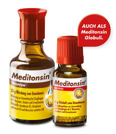 Meditonsin® Tropfen. Zusammensetzung: 10 g Mischung (19 Tropfen/g) enthalten: Aconitinum Dil. D5 (HAB,V.5a) 1 g, Atropinum sulfuricum Dil. D5 5 g, Mercurius cyanatus Dil. D8 4 g. Aconitinum ab D2, Atropinum sulfuricum ab D2 und Mercurius cyanatus ab D4 jeweils potenziert mit einer Mischung aus Ethanol 94% (G/G)/Glycerol 85%/ Gerei-nigtes Wasser (5:10:85). Enthält 6 Vol.-% Alkohol. Meditonsin® Globuli. Zusammensetzung: In 10 g Globuli (Größe 5) sind verarbeitet: Aconitinum Dil. D5 [HAB, Vorschrift 5a, Lösung D2 mit Ethanol 86% (m/m)] 10 mg, Atropinum sulfuricum Dil. D5 50 mg, Mercurius cyanatus Dil. D8 40 mg. Aconitinum D2 und D3, Atropinum sulfuricum D2 und D3 und Mercurius cyanatus D4 bis D6 jeweils potenziert mit einer Mischung aus Ethanol 94% (m/m)/ Glycerol 85%/ Gereinigtes Wasser (5:10:85); Aconitinum D4, Atropinum sulfuricum D4 und Mercurius cyanatus D7 jeweils potenziert mit Ethanol 73% (m/m). Anwendungsgebiete: Die Anwendungsgebiete leiten sich von den homöopathischen Arzneimittelbildern ab. Dazu gehören: Akute Entzündungen des Hals-, Nasen- und Rachenraumes. Gegenanzeigen: Überempfindlichkeit gegen die Wirkstoffe oder einen der sonstigen Bestandteile, Säuglinge unter sieben Monaten, Säuglinge von 7 bis 12 Monaten nur nach Rücksprache mit dem Arzt. Meditonsin® Tropfen: Nicht anzuwenden bei Alkoholkranken. Meditonsin® Globuli: Enthält Sucrose. Nicht anzuwenden bei Patienten mit der seltenen hereditären Fructose-Intoleranz, Glucose-Galactose-Malabsorption oder Saccharase-Isomaltase-Mangel. Nebenwirkungen: Nach Anwendung von Meditonsin® Tropfen und Globuli kann Speichelfluss auftreten, das Mittel ist dann abzusetzen. Es können Überempfindlichkeitsreaktionen (z. B. Juckreiz und Hautausschlag) auftreten. In diesem Fall ist das Arzneimittel abzusetzen. Hinweis: Bei der Einnahme von homöopathischen Arzneimitteln können sich die vorhandenen Beschwerden vorübergehend verschlimmern (Erstverschlimmerung). In diesem Fall sollte das Arzneimittel abgesetzt und ein Arzt befragt werden. Dosierung: Siehe Gebrauchsinformation. Darreichungsform, Packungsgrößen Tropfen: 35 g Mischung, 70 g Mischung und 100 g (2 x 50 g) Mischung zum Einnehmen. Darreichungsform, Packungsgrößen Globuli: 8 g Globuli zum Einnehmen. Stand: 04/2016 bzw. 11/2016. MEDICE Arzneimittel, 58638 Iserlohn.
