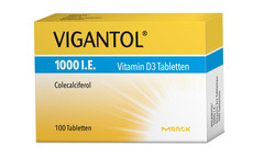 Bezeichnung: VIGANTOL® 500 I.E./1000 I.E. Vitamin D3 Tabletten. Pharmazeutischer Unternehmer: Merck Selbstmedikation GmbH, Frankfurter Straße 250, 64293 Darmstadt. Zusammensetzung: 1 Tablette 500 I.E./1000 I.E. enthält 12,5 μg/25 μg Colecalciferol, entspr. 500 I.E./1000 I.E. Vitamin D. Sonstige Bestandteile: Hochdisperses Siliciumdioxid (Ph.Eur.), Maisstärke (Ph.Eur.), Carboxymethylstärke-Natrium (Typ C) (Ph.Eur.), Talkum (Ph.Eur.), Magnesiumstearat (Ph.Eur.), Natriumascorbat (Ph.Eur.), mittelkettige Triglyceride (Ph.Eur.), mikrokristalline Cellulose (Ph.Eur.), Mannitol (Ph.Eur.), modifizierte Stärke, Sucrose (Ph.Eur.), α-Tocopherol (Ph.Eur.). Anwendungsgebiete: Zur Vorbeugung gegen Rachitis und Osteomalazie bei Kindern und Erwachsenen. Zur Vorbeugung gegen Rachitis bei Frühgeborenen. Zur Vorbeugung bei erkennbarem Risiko einer Vitamin-D-Mangelerkrankung bei ansonsten Gesunden ohne Resorptionsstörung bei Kindern und Erwachsenen. Zur unterstützenden Behandlung der Osteoporose bei Erwachsenen. Gegenanzeigen: Überempfindlichkeit gegen Colecalciferol od. sonst. Bestandteile. Hypercalcämie u./od. Hypercalciurie, Pseudohypoparathyreoidismus. Nur mit besond. Vorsicht anwenden bei: Neigung zur Bildung calciumhaltiger Nierensteine, gestörter renaler Calcium- u. Phosphatausscheidung, Behandl. mit Benzothiadiazin-Derivaten, immobilisierten Pat., Pat. mit Sarcoidose od. Niereninsuff.. Nebenwirkungen: Stoffwechsel- u. Ernährungsstör.: Hypercalcämie u. Hypercalciurie. Erkrank. des Gastrointest.-trakts: Gastrointest. Beschwerden wie Obstipation, Flatulenz, Übelk., Abdominalschmerzen od. Diarrhoe. Erkrank. der Haut u. des Unterhautzellgewebes: Überempfindlichkeitsreakt. wie Pruritus, Hautausschlag od. Urtikaria. Warnhinweise u. Vorsichtsmaßnahmen: Enthält Sucrose (Zucker).