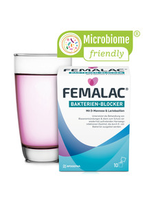 Das Besondere: FEMALAC®Bakterien-Blocker erhielt als erstes Präparat zur unterstützenden Behandlung und Prävention von Blasenentzündungen das Microbiome-friendly® Siegel.[5]Diese unabhängige Zertifizierung garantiert die Mikrobiom-Freundlichkeit der einzigartigen Duo-Aktiv-Formel mit D-Mannose und Laktobazillen. Durch das standardisierte Verfahren während des Zertifizierungsprozesses wird mit Erteilung des Siegels garantiert, dass das FEMALAC® Bakterien-Blocker in Hinblick auf neueste wissenschaftliche Erkenntnisse das Mikrobiom intakt lässt und dessen Diversität und Balance respektiert.