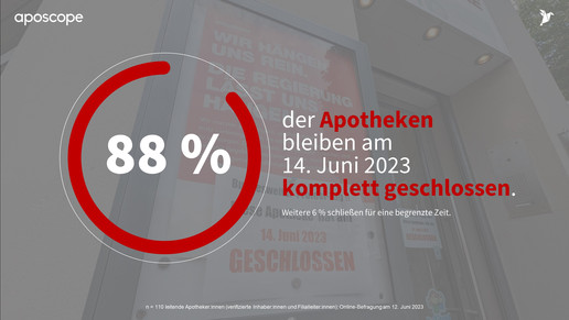 Berlin - Am morgigen Mittwoch, dem 14. Juni 2023, werden die meisten deutschen Apotheken schließen. 88 Prozent der leitendenden Apotheker:innen haben in einer aktuellen Befragung des Marktforschungsteams von aposcope erklärt, ihre Apotheke am 14. Juni komplett schließen zu wollen. Weitere 6 Prozent möchten die Apotheke zumindest zeitweise zusperren. Damit können viele Arzneimittel nur über Nacht- und Notdienstapotheken eingelöst werden.