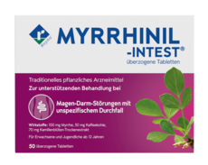 *MYRRHINIL-INTEST® Anwendungsgebiete: Traditionelles pflanzliches Arzneimittel zur unterstützenden Behandlung bei Magen-Darm-Störungen mit unspezifischem Durchfall, begleitet von leichten Krämpfen und Blähungen ausschließlich aufgrund langjähriger Anwendung. Zusammensetzung: 1 überzogene Tablette enthält: 100 mg Myrrhe, 50 mg Kaffeekohle, 70 mg Trockenextrakt aus Kamillenblüten (4-6:1); Auszugsmittel: Ethanol 60 % (m/m). Sonstige Bestandteile: Gelbes Wachs, Calciumcarbonat, Carnaubawachs, Cellulosepulver, Eisenoxide und -hydroxide E 172, Eisen(III)-oxid E 172, sprühgetrockneter Glucose-Sirup, Kakaobutter, Macrogol 6000, Povidon K-90, Schellack (gebleicht, wachsfrei), hochdisperses Siliciumdioxid, Stearinsäure (Ph.Eur.) [pflanzlich], Saccharose, Talkum, Titandioxid E 171. Enthält Glucose und Saccharose (Zucker). Gegenanzeigen: Überempfindlichkeit gegen Kamille, andere Korbblütler, Myrrhe, Kaffeekohle oder einen der sonstigen Bestandteile. Kinder unter 6 Jahren. Nebenwirkungen: Häufigkeit nicht bekannt: Überempfindlichkeitsreaktionen insbesondere bei Allergikern. Pharmazeutischer Unternehmer: Repha GmbH Biologische Arzneimittel, Alt-Godshorn 87, 30855 Langenhagen. Stand 10/24.