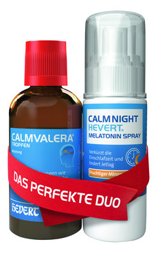 Mundschleimhaut resorbiert. Es enthält pro Sprühstoß 1 mg des physiologischen Schlafhormons Melatonin und hilft dabei, schneller einzuschlafen. Die ideale Ergänzung zu CalmNight Hevert Melatonin Spray ist das naturheilkundliche Arzneimittel Calmvalera, in dem neun Inhaltsstoffe sorgfältig aufeinander abgestimmt sind. Es hilft gezielt gegen nervöse Unruhe am Tag. Die Kombination der neun psychotropen Wirkstoffe in einem einzigen Komplexmittel existiert auf dem deutschen Markt kein zweites Mal. Calmvalera Tropfen und Tabletten sind also einzigartig. Der rasche Wirkeintritt ist klinisch belegt3, Wechselwirkungen oder ein Abhängigkeitspotenzial sind nicht bekannt. Perfekt also, um auch tagsüber zur Ruhe zu kommen.