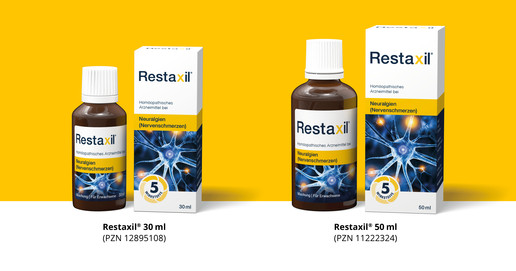 RESTAXIL. Wirkstoffe: Gelsemium sempervirens Dil. D2, Spigelia anthelmia Dil. D2, Iris versicolor Dil. D2, Cyclamen purpurascens Dil. D3, Cimicifuga racemosa Dil. D2. Homöopathisches Arzneimittel bei Neuralgien (Nervenschmerzen). www.restaxil.de • Zu Risiken und Nebenwirkungen lesen Sie die Packungsbeilage und fragen Sie Ihre Ärztin, Ihren Arzt oder in Ihrer Apotheke. • Restaxil GmbH, 82166 Gräfelfing