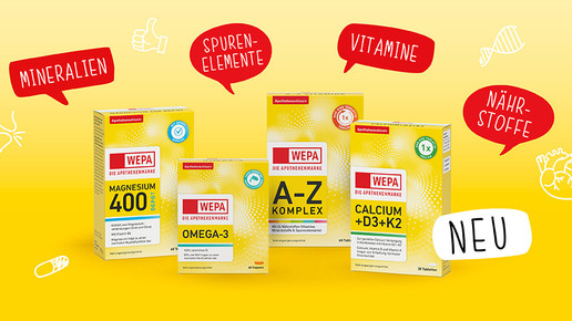 Mit der Einführung von A-Z Komplex, Omega 3, Calcium+D3+K2 und Magnesium 400 Depot läutet WEPA den Startschuss für eine neue Produktlinie unter dem Markendach von WEPA – Die Apothekenmarke ein. Der Apothekenbedarfshändler arbeitet kontinuierlich am Ausbau der Premium-Marke – immer mit dem Ziel: maximale Qualität. Laut Unternehmen bieten die Produkte weitere entscheidende Vorteile für Apotheken: Apothekenexklusivität und attraktive Konditionen.