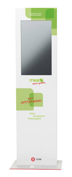 Über die INFOTERMINALS stehen interaktive und leicht verständliche Informationen zur Verfügung, die das Kundengespräch bereichern. So können zum Beispiel komplexe Wirkmechanismen auf dem großen Display veranschaulicht werden, um das Verständnis für die regelmäßige Einnahme oder die richtige Anwendung von Produkten wie Asthmasprays zu fördern. Zusätzlich laden saisonale Themen Kundinnen und Kunden dazu ein, sich umfassend und eigenständig zu informieren. Für die mea-Apotheken wird das INFOTERMINAL in weiß mit dem bekannten grünen Logo bereitgestellt. Zusätzlich zu den regulären Inhalten gibt es außerdem einen eigenen Button auf dem Touchscreen, der Zugriff auf exklusive mea-Inhalte erlaubt. Alle Inhalte können ganz einfach direkt per E-Mail vom INFOTERMINAL aus nach Hause geschickt werden.