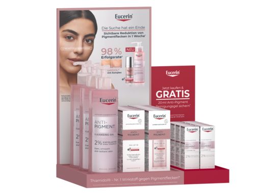 Im September wird die Einführung des neuen Eucerin Anti-Pigment Reinigungsgels und des Eucerin Anti-Pigment Relaunches in der Apotheke mit einer aufmerksamkeitsstarken Produktplatzierung begleitet. Die Kund*innen werden besonders durch Dekomaterial, Aufsteller und einer separaten Präsentation des Eucerin Anti-Pigment Reinigungsgels angesprochen. Als Anreiz erhalten Konsument*innen im Aktionszeitraum beim Kauf eines Anti-Pigment Produktes das neue Anti-Pigment Reinigungsgel in 20ml gratis dazu. Dieses Angebot gilt nur in teilnehmenden Apotheken.