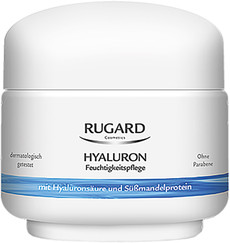 Die RUGARD Hyaluron-Feuchtigkeitspflege macht sich die Eigenschaften des Hyalurons zunutze: Der Inhaltsstoff Hyaluron bindet Wasser und sorgt dafür, dass die Haut auch an heißen Tagen mit ausreichend Feuchtigkeit versorgt ist. Durch die Fähigkeit, Wasser zu binden, polstert Hyaluron die Haut von innen auf und wirkt kleinen Fältchen entgegen. Es macht sie elastischer und strafft sie. Daher wird Hyaluron nicht nur gerne in Feuchtigkeitspflegen verwendet, sondern ist auch Bestandteil vieler Anti-Aging-Produkte.