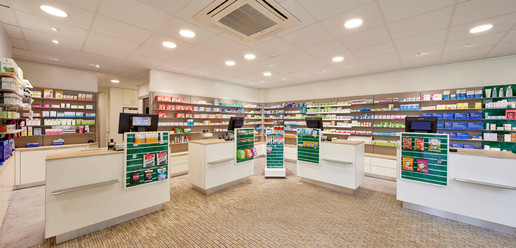 Durch das im Erdgeschoss gewonnene Platzangebot gelangt der Kunde über einen barrierefreien Eingangsbereich in eine offene und übersichtliche Offizin. Deren helle und gut geordnete Einrichtung unterstreicht die Raumatmosphäre. Willkommene Farbtupfer im Mobiliar verstärken das optisch leichte Ambiente im Zusammenspiel eines perfekten Beleuchtungskonzepts. Zu den in der neuen Akustikdecke installierten Lichtelementen gehört die Klimatisierung der pharmazeutischen Bereiche.