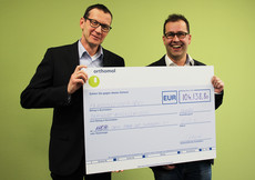Dr. Michael Schmidt, Geschäftsführer der Orthomol pharmazeutische Vertriebs GmbH (r.), überreicht Daniel Schröder, stellvertretender Leiter des christlichen Kinder- und Jugendwerks „Die ARCHE e.V.“ (l.), den symbolischen Spendenscheck in Höhe von 104.138,80 Euro.