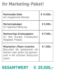 Insgesamt wird der Apotheke ein Produkt- & Coaching-Paket im Wert von € 25.000,- zur Verfügung gestellt, mit dem rasch neue Umsätze/Erträge erzielt werden.