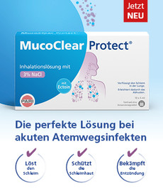 Starnberg - Die neue MucoClear Protect Inhalationslösung ist eine hypertone Salzlösung in Kombination mit Ectoin zum Schutz der Schleimhaut und zur Eindämmung der Entzündung. Sie ist die perfekte Inhalationslösung bei entzündlichen Atemwegserkrankungen wie z. B. Bronchitis, Bronchiolitis, Asthma bronchiale oder COPD.