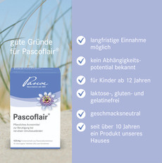 Pflanzliche Extrakte, wie die aus der Passionsblume, können helfen wieder zur Ruhe zu kommen, die Stressresistenz zu verstärken und trotzdem mental leistungsfähig zu bleiben. Pascoflair®, das bewährte Präparat mit seinem hohen Gehalt von 425 mg Passionsblumenextrakt pro Tablette ist gut verträglich und kann auch längerfristig eingenommen werden. Es lässt Ihre Kundinnen im Alltag einen kühlen Kopf bewahren und hilft ihnen das Zusammenspiel von Familie, Job und den eigenen Bedürfnissen zu meistern.