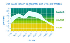 Für zuverlässige Aussagen müsste die Pufferkapazität im Blut und noch besser die im Bindegewebe getestet werden. Letzteres ist unmöglich, ersteres sehr aufwendig. Der Urin-pH-Test dagegen ist eine einfache, erstaunlich aussagekräftige und zudem wissenschaftlich nachgewiesene* Methode, den Säure-Basen-Haushalt zu testen. Einmalige Tests haben jedoch keinen Aussagewert. Ca. 3 Testungen über den Tag sind notwendig. Die so ermittelte pH-Wert-Kurve sollte schwanken: Im Idealfall ergibt sich eine M-förmige Kurve. Das kommt daher, dass die Nieren während der Nacht Säure ausscheiden – deshalb ist der Morgen-Urin meist sauer (pH auch unter 6). Die Belegzell-Aktivität in Zusammenhang mit Mahlzeiten führt zu so genannten Basenfluten nach den Mahlzeiten, also Urin-pH-Werten, die den basischen Bereich (deutlich über pH 7) erreichen sollten.