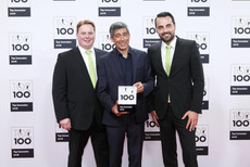André Ratz, Bereichsleitung Personal und Controlling (l.) und Dr. Jochen Kühn, Bereichsleitung Marketing (r.) nehmen den Preis „TOP 100“ von TOP 100 Mentor Ranga Yogeshwar entgegen.