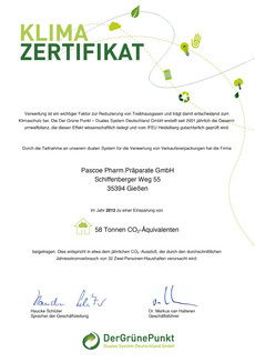 Durch die Einsparung trägt PASCOE Naturmedizin entscheidend zum Klimaschutz bei. Ein wichtiger Faktor, um Treibhausgase zu reduzieren, ist die fachmännische Aufbereitung und (Wieder-)Verwertung von Verkaufsverpackungen. Für die effektive Umsetzung dieser Maßnahme wurde das in Mittelhessen ansässige Familienunternehmen erneut mit dem Klimazertifikat der „Duales System Deutschland GmbH“ (Der Grüne Punkt) ausgezeichnet. Durch die Teilnahme am Recyclingprogramm hat PASCOE Naturmedizin im vergangenen Jahr 58 Tonnen CO2-Äquivalente eingespart. Das entspricht in etwa dem jährlichen Kohlendioxidausstoß, der durch den Stromverbrauch von 32 Zwei-Personen-Haushalten verursacht wird.