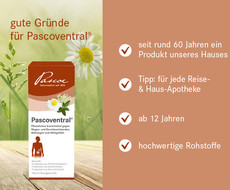 Kamille, Kümmel und Pfefferminze sind die ausgesuchten Wirkstoffe des pflanzlichen Arzneimittels Pascoventral®, das nun bereits seit 60 Jahren zur Behandlung von Verdauungsbeschwerden, besonders mit leichten Krämpfen im Magen-Darm-Bereich, Blähungen und Völlegefühl eingesetzt wird. Die gute Verträglichkeit, einfache Dosierung und zuverlässige Wirksamkeit sorgen seither für ein gutes Bauchgefühl.