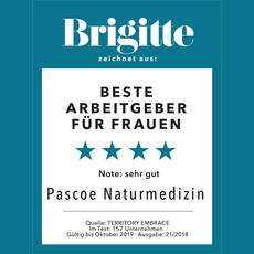 Gießen - Mit der Note „sehr gut“ wurde der Hersteller von Naturmedizin aus Gießen von der Frauenzeitschrift BRIGITTE als einer der besten Arbeitgeber für Frauen in Deutschland ausgezeichnet. Das Unternehmen erhielt die Bewertung „sehr gut“ und erreichte 4 von 5 möglichen Sternen. Pascoe Naturmedizin beteiligte sich im Frühjahr an einer groß angelegten Studie zur Arbeitssituation von Frauen in Deutschland, die von der Frauenzeitschrift initiiert wurde.