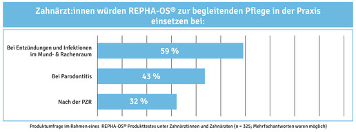 Eschborn - Natürlich-pflegende Alternativen zu Chlorhexidin sind in deutschen Zahnarztpraxen eine willkommene Option – das bestätigt die aktuelle Befragung von 528 Zahnarztpraxen1: Denn die Dentalmediziner überzeugt am meisten, dass sie ein pflanzliches Mundspray zur Oralpflege (REPHA-OS) einsetzen können, das nicht nur zuckerfrei ist, sondern auch kein Chlorhexidin enthält – und damit kein Risiko für Zahnverfärbungen oder Hypogeusie birgt. Außerdem sind die - in Studien2,3 nachgewiesenen – Multi-Target-Effekte versus pathogene Mundbakterien eine weitere wissenschaftliche Rationale für dessen Einsatz; beispielsweise auch zur erfrischenden Befeuchtung der Mundschleimhaut. Aufgrund seiner multiplen Eigenschaften verwenden die befragten Zahnärzte das pflanzliche Mundspray zur adjuvanten Oralpflege vorwiegend bei Inflammationen (z.B. Parodontitis) und Infektionen im Mund- und Rachenraum sowie nach einer PZR. Interessierte Dentalpraxen können eine Testpackung anfordern bei: info(@)repha.de (Stichwort Testpaket REPHA-OS).