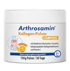 Der menschliche Organismus benötigt Kollagen. Zur Förderung der Kollagenbildung ist deshalb eine Nahrungsergänzung sehr empfehlenswert. Arthrosamin® Kollagen-Pulver Complex (150g Dose - PZN 16958478) enthält die optimal angepasste Wirkstoffkombination von Kollagenpeptiden, Curcumin, Vitamin C sowie bioaktivem Glucosamin. Das zugesetzte Orangenpulver macht das Pulver zu einem köstlichen Getränk für morgens und abends. Die empfohlene tägliche Zufuhr von 5 g Kollagen entspricht 2 Dosierlöffeln Arthrosamin® Kollagen-Pulver Complex. Zum Erhalt normaler Knorpelbildung1) und für die Muskeln2). Für eine spür- und sichtbare Erholung der betroffenen Gewebe wird eine Kur von acht bis zwölf Wochen empfohlen.