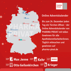 Braunschweig - 24 Tage lang können ab sofort alle Mitarbeiterinnen und Mitarbeiter einer Apotheke den PHARMA PRIVAT Online Adventskalender öffnen und täglich schöne Preise gewinnen.