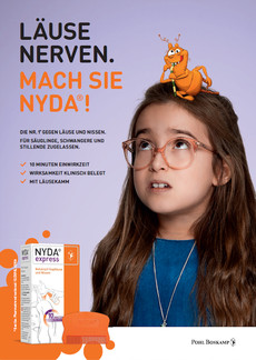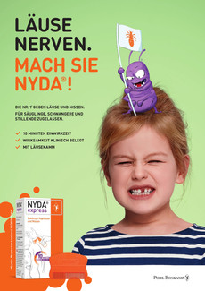 Unter dem Claim „Läuse nerven. Mach sie NYDA®!" hat PUK in Zusammenarbeit mit Pohl-Boskamp verschiedene Anzeigen-Motive, Online-Filme, Display und Social Ads entwickelt. Zudem beinhaltet die Kampagne diverse POS-Maßnahmen und Give-aways wie Mützen und Läuse-Tattoos.