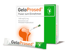 GeloProsed® Pulver zum Einnehmen. Z. Linderung d. Symptome v. Erkältungskrankheiten u. grippalen Infekten, w. Schmerzen, Kopfschmerzen, Halsschmerzen u. Fieber, wenn diese m. einer Anschwellung d. Nasenschleimhaut einhergehen. F. Erw., ält. Menschen u. Jugendl. ab 12 Jahren. Zusammens.: 1 Btl. (1.635 mg) enth. 1.000 mg Paracetamol, 12,2 mg Phenylephrinhydrochlorid. Sonst. Bestandt. je Btl.: 20,0 mg Aspartam u. 23,8 mg Natrium sowie Ascorbinsäure, Xylitol, Ethylcellulose, Natriumcarbonat, Weinsäure, Magnesiumcitrat, Magnesiumstearat u. Cassis-Aroma. Gegenanz.: Überempfindlichk. gegen Paracetamol, Phenylephrin od. einen d. sonst. Bestandt., schwere koronare Herzkrankh., Hypertonie od. Phäochromozytom, Hyperthyreose, Patienten, d. m. einem MAO-Hemmer behandelt werden od. b. denen eine Behandl. m. einem MAO-Hemmer v. weniger als 2 Wochen beendet wurde, stark eingeschr. Leberfunktion, Alkoholabusus. Nebenwirk.: Paracetamol: selten: Erkr. d. Blutes u. d. lymphatischen Systems: selten: Störungen der Blutzusammensetzung einschließl. Störungen d. Thrombozyten, Agranulozytose, Leukopenie, Thrombozytopenie, hämolyt. Anämie, Panzytopenie; Erkr. d. Haut u. d. Unterhautzellgewebes: selten: Überempfindlichkeitsreaktionen einschließl. Hautausschlag u. Urtikaria, Pruritus, Schwitzen, Purpura, Angioödem; sehr selten: schwere Hautreaktionen; Erkr. d. Immunsystems: selten: allerg. od. Überempfindlichkeitsreaktionen einschließl. Hautausschlägen, Urtikaria, anaphylaktischer Reaktion u. Bronchospasmus; Leber- u. Gallenerkrankungen: selten: pathologische Leberfunktion (Anstieg d. hepatischen Transaminasen), Leberversagen, Lebernekrose, Ikterus; Erkr. d. Nieren u. Harnwege: sehr selten: interstitielle Nephritis nach längerer Anw. höherer Dosen Paracetamol, sterile Pyurie (trüber Urin); es wurden Einzelf. v. Larynxödem, anaphylaktischem Schock, Anämie, Veränderungen d. Leber u. Hepatitis, Veränderungen d. Nieren (schwerwiegende Niereninsuffizienz, Hämaturie, Anurie), gastrointestinalen Wirkungen u. Schwindel m. unbekannter Häufigkeit gemeldet. Phenylephrin: Erkr. d. Nervensystems: sehr selten: Schlaflosigkeit, Nervosität, Tremor, Angst, Ruhelosigkeit, Verwirrtheit, Reizbarkeit, Schwindel u. Kopfschmerzen können auftreten. Herzerkrankungen: selten: Tachykardie, Palpitationen; Gefäßerkrankungen: selten: Blutdruckanstieg; Erkr. d. Gastrointestinaltrakts: Häufig: Anorexie, Übelk. u. Erbrechen; Erkr. d. Immunsystems: selten: allerg. o. Überempfindlichkeitsreaktionen einschließl. Hautausschlag, Urtikaria, anaphylaktischer Reaktion u. Bronchospasmus. Kinder: Es ist davon auszugehen, d. Häufigk., Art u. Schweregrad v. Nebenw. b. Kindern über 16 Jahren denen b. Erw. entsprechen. Enth. Aspartam u. Natriumcarbonat. G. Pohl-Boskamp GmbH & Co. KG, 25551 Hohenlockstedt (3)