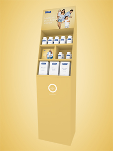 Das Bodendisplay ist aus Karton gefertigt und deshalb besonders leicht und flexibel – es lässt sich in wenigen Schritten auf- bzw. abbauen und frei in der Apotheke positionieren. Mit einer Höhe von 155 cm schafft es große Aufmerksamkeit sowie eine zusätzliche Verkaufsfläche in der Apotheke. Das Design des Bodendisplays variiert je nach Kampagne. Es greift die Bild- und Farbwelt des dazugehörenden Kampagnenspots auf und hat somit einen hohen Wiedererkennungswert beim Endkunden.