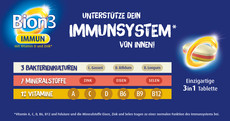 Bion3 IMMUN* ist für viele Apothekenkunden eine gute Empfehlung, denn es enthält 7 Mineralstoffe und 12 Vitamine, darunter Vitamin A, D, C, B6, B12 sowie Folsäure und Eisen, Zink und Selen, die zu einer normalen Funktion des Immunsystems beitragen. Bion3 IMMUN* enthält außerdem drei spezielle, lebende Bakterienkulturen (Lactobacillus gasseri, Bifidobacterium bifidum und Bifidobacterium longum). Zudem verfügt Bion3 IMMUN* über eine patentierte** Beschichtung der Tablette, die die enthaltenen Bakterien-